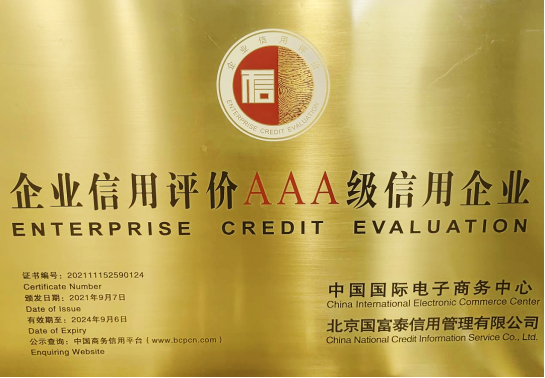 AAA级信用企业,是企业信用最高等级,代表着企业信用程度高,合同履约能力强。该类企业具有优秀的信用纪录,经营状况佳,盈利能力强,开展前景广阔,不确定性因素对其经营和开展的影响极小,客观反应了企业信用状况。
