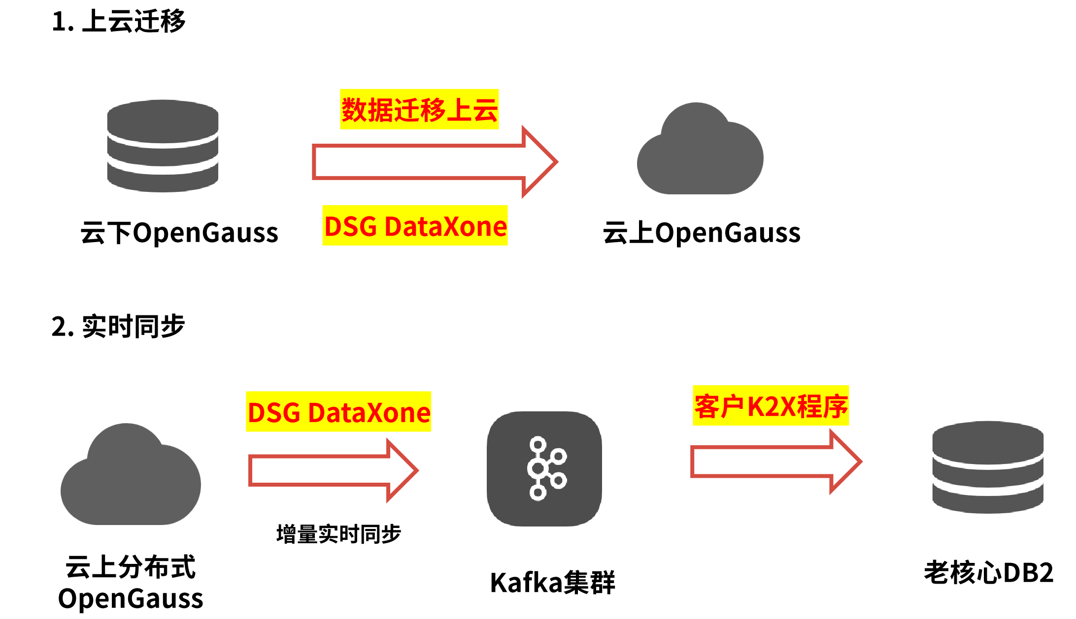 在国产化浪潮有助于下,健康险商保核心系统将新业务底层数据存放在国产数据库OpenGauss中,而老核心系统底层数据都在DB2上。为新老核心系统共存,需要把新核心系统上新增的数据,经过处理后同步更新到老核心系统中。同时,为方便统一管理服务器和数据库,企业要将现有云下OpenGauss数据库数据全部迁移到云上OpenGauss数据库中,逐步替换云下环境。