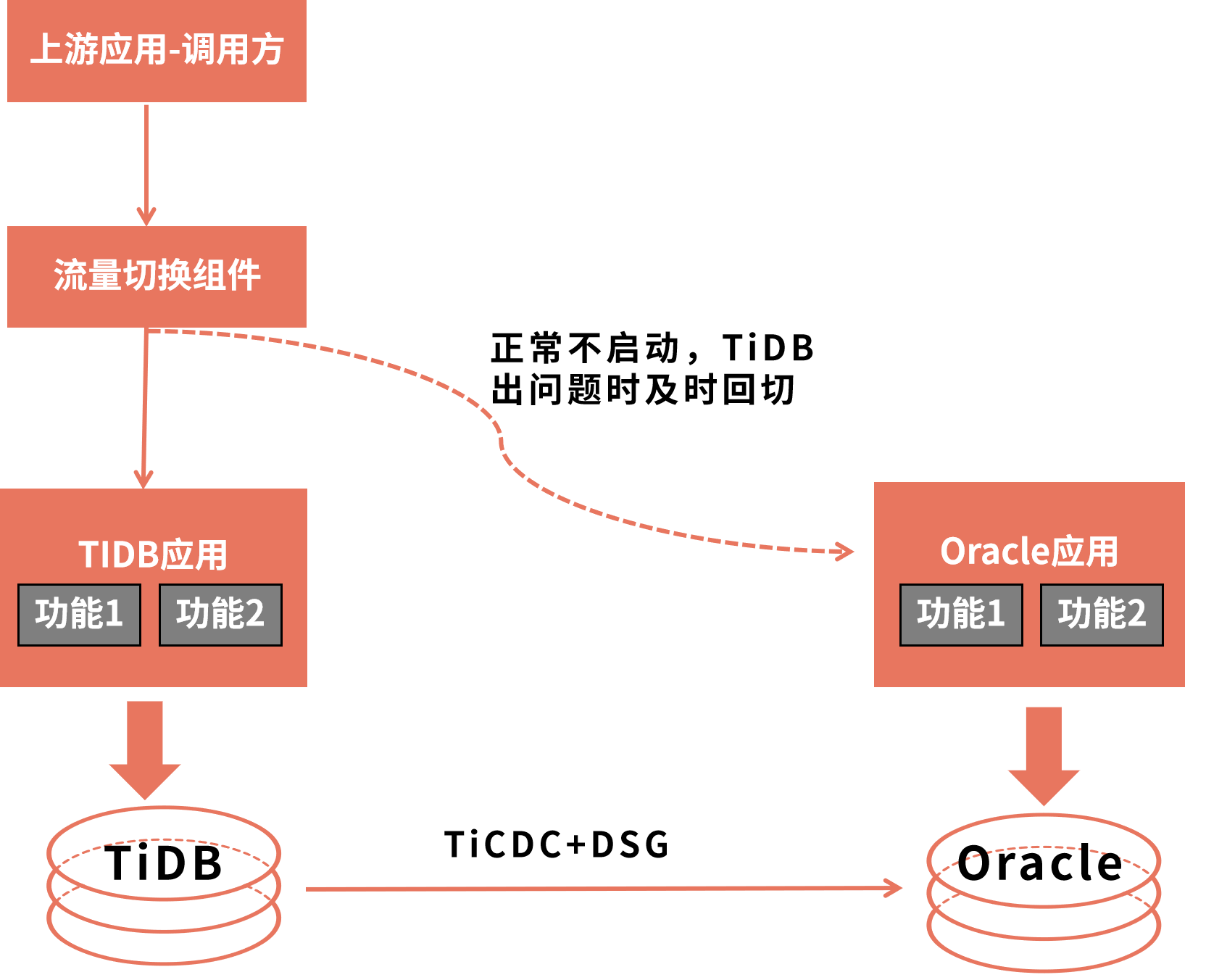为了保障非车保单中心全栈信创切换上线,该保险集团采用了一次切换、双轨运行的方案。TiDB作为主数据库承担全流量,同时与Oracle进行准实时同步。确保如果发现严重性能问题或数据一致性导致的功能等问题无法满足业务需求,可以顺利获得应急回退将保单排车业务从TiDB回切到Oracle生产库。