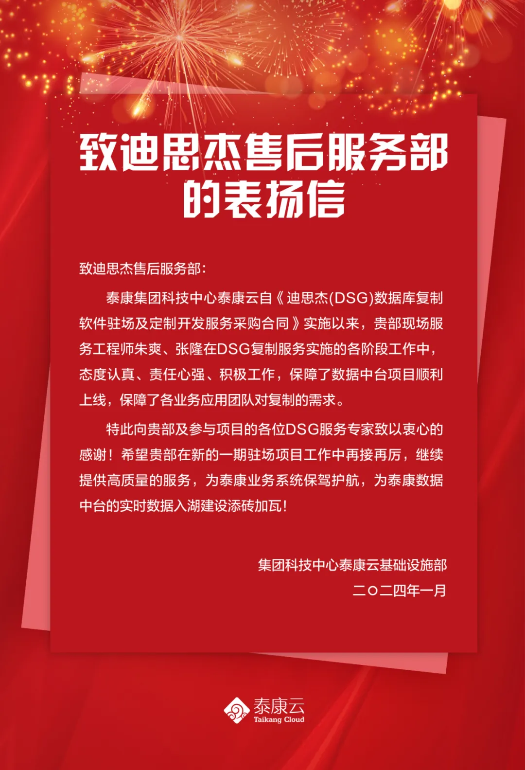 2024年1月22日,泰康集团向金年会诚信至上(北京)数据管理技术有限公司发来一封表扬信,对金年会诚信至上现场服务工程师朱爽、张隆在项目工作中展现的专业素养和敬业精神,给予了高度认可和衷心感谢!