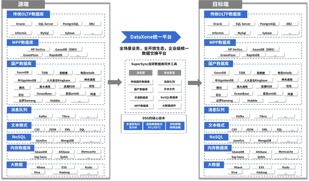 3.多源异构兼容:适用于市场上绝大多数数据库,如国外主流商业版数据库、国产数据库、开源数据库及各类文件等,目标端支持大数据组件、分布式数据库、数仓、数据中台等。对客户复杂环境的适配全面,支持UNIX、Linux、Windows、AS400、虚拟化、云等。