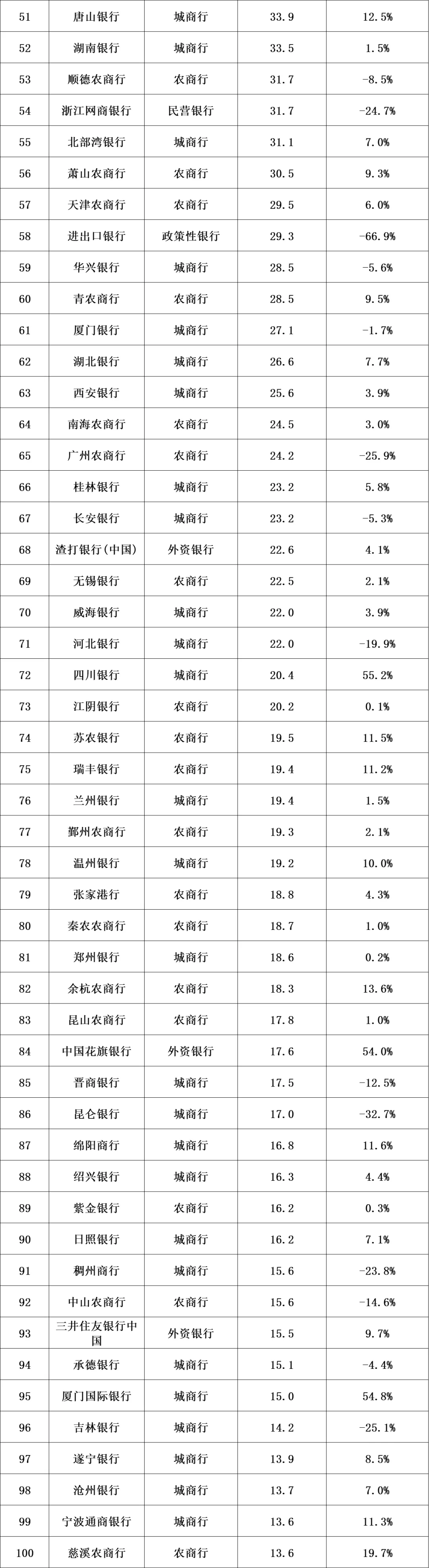 近期,国家金融监管总局发布了2024年中国银行业净利润TOP100银行的名单。