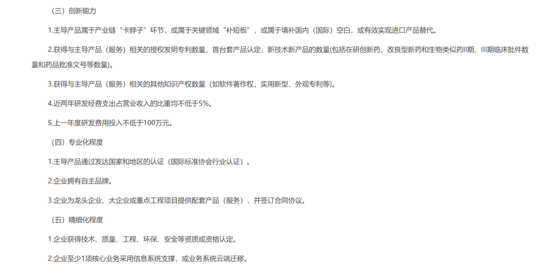 根据2022年北京市“专精特新”认定条件,入选企业需要在经营业绩、创新能力、专业化程度、精细化水平等方面达到高标准水平,并且在产品研发领域拥有突出成果,要求主导产品属于产业链“卡脖子”环节,或属于关键领域“补短板”,或属于填补国内(国际)空白,或有效实现进口产品替代。
