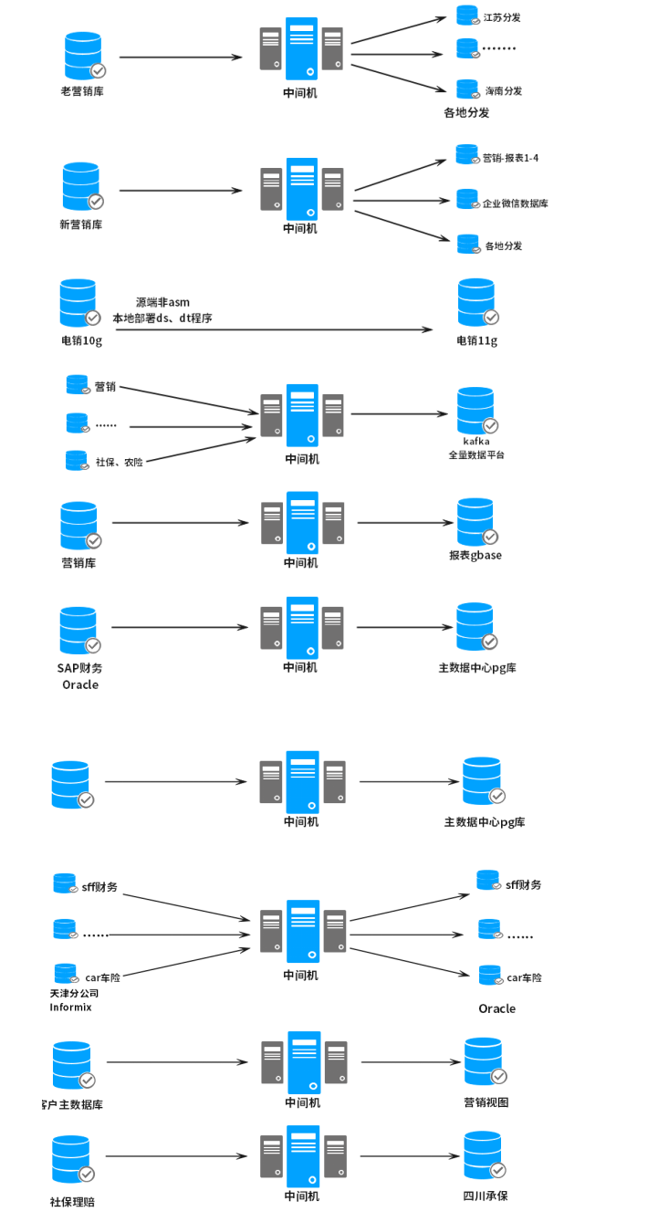财险公司主要承担财产损失的赔付责任,业务覆盖范围广,IT系统复杂性强,内部数据流转错综复杂。为适配业务开展带来的系统更新换代,一对一、一对多、多对一、多对多数据同步需求多样。