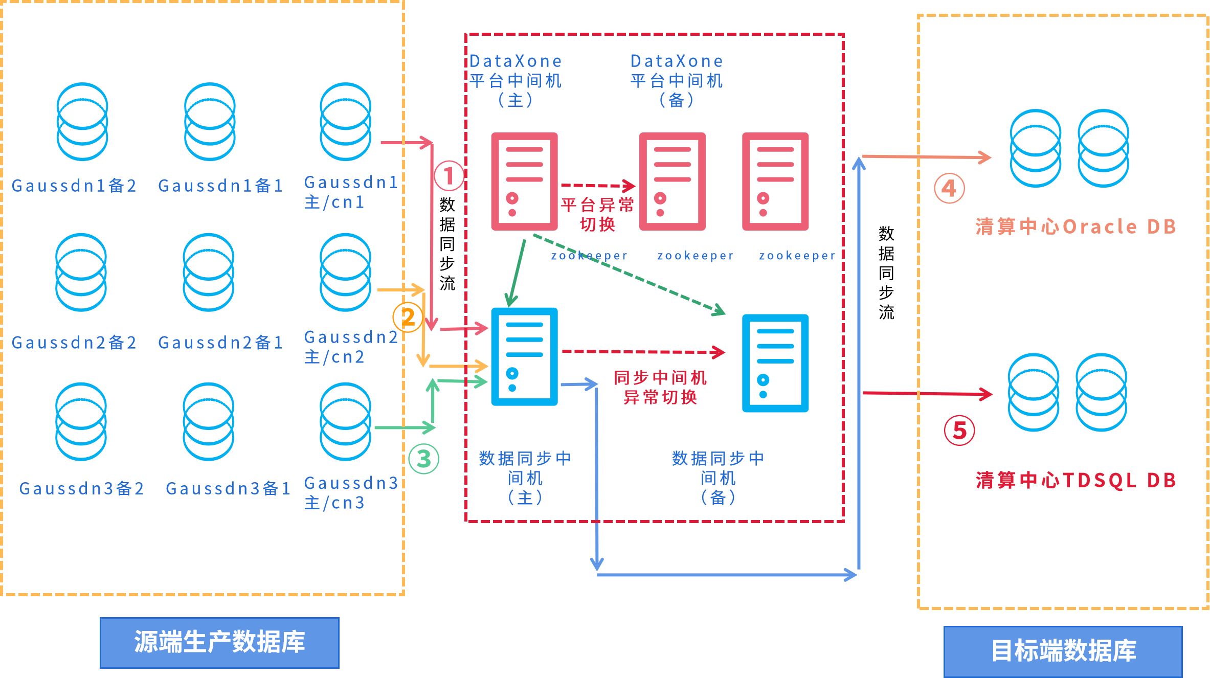 此次该行清算总中心全栈国产化,采用中间机部署模式,金年会诚信至上 DataXone部署架构为高可用,由两台DataXone主备、数据库主主复制、Manager主备及zookeeper集群组成。同步链路所在中间机由两台组成,并创建及关联高可用主机组,以应对同步链路高可用切换需求。