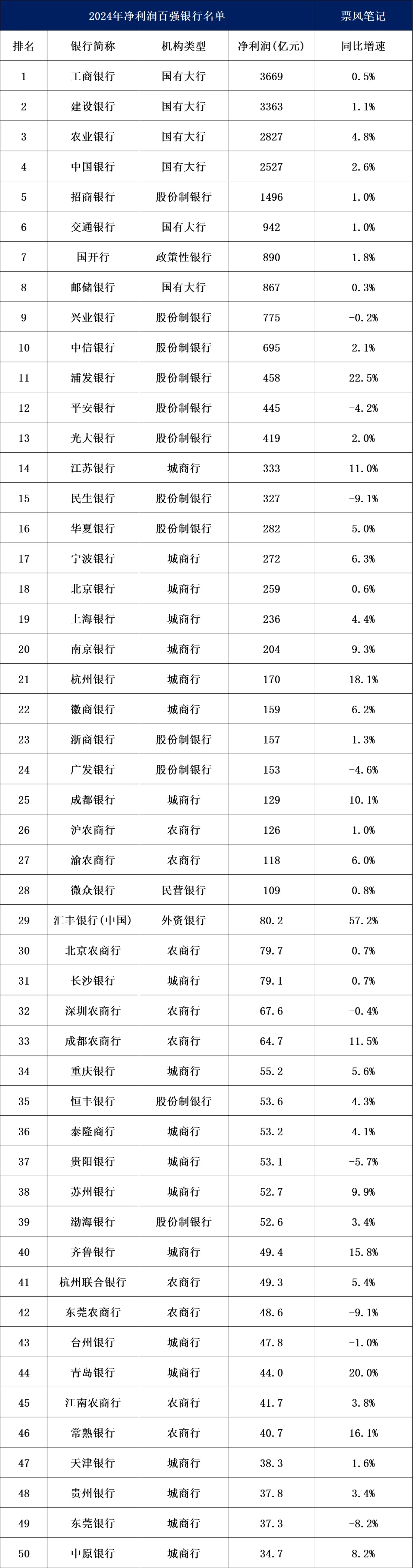 近期,国家金融监管总局发布了2024年中国银行业净利润TOP100银行的名单。